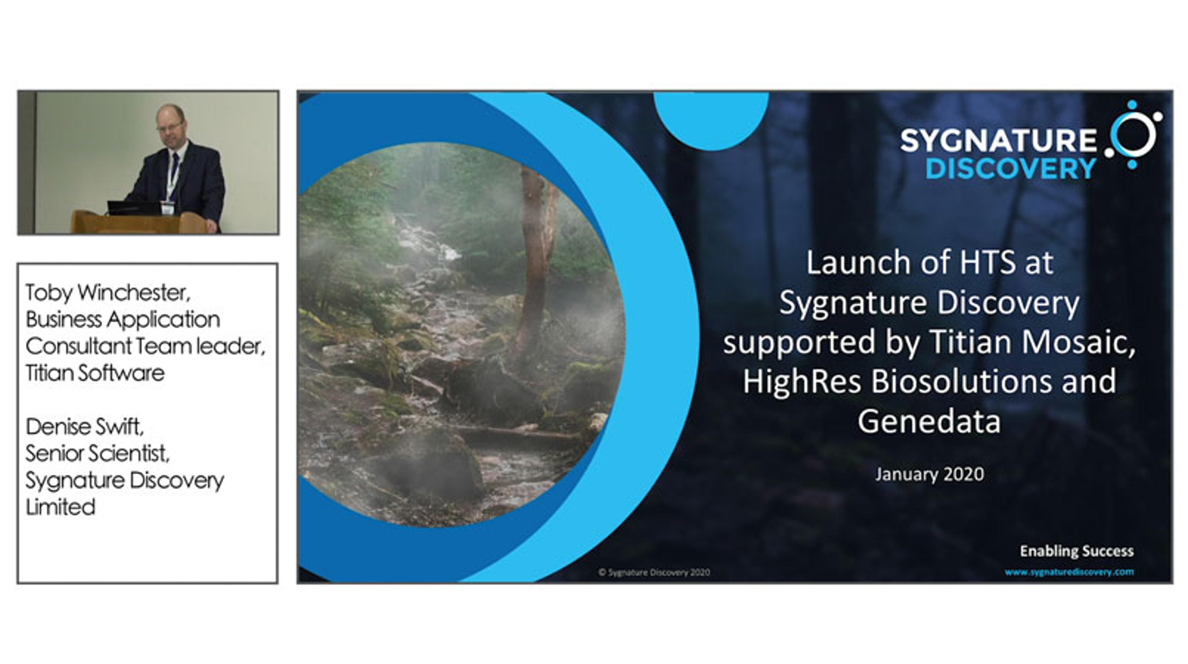 In this workshop presentation, Denise Swift, senior scientist at Sygnature Discovery, discusses how high-throughput screening (HTS) was established at Sygnature Discovery in Nottingham, U.K., with the support of Titian Mosaic, HighRes Biosolutions and Genedata. HTS was introduced to complement its existing suite of hit-finding approaches and offer a more comprehensive integrated hit-discovery platform to enhance successful early drug discovery for their clients.