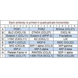 6Ckine (CCL21), BLC (CXCL13), CTACK (CCL27), CXCL16, Eotaxin-1 (CCL11), Eotaxin-2 (MPIF-2/CCL24), Fractalkine (CX3CL1), I-309 (TCA-3/CCL1), I-TAC (CXCL11), KC (CXCL1), LIX, MCP-1 (CCL2), MCP-5, MDC (CCL22), MIG (CXCL9), MIP-1 alpha (CCL3), MIP-1 gamma, MIP-2, MIP-3 alpha (CCL20), MIP-3 beta (CCL19), Platelet Factor 4 (CXCL4), RANTES (CCL5), SDF-1 alpha (CXCL12 alpha), TARC (CCL17), TECK (CCL25)
