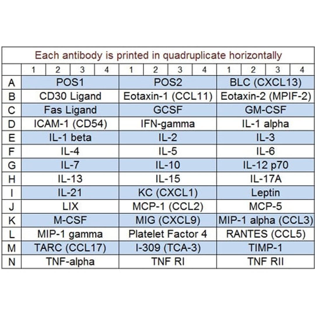 BLC (CXCL13), CD30 Ligand (TNFSF8), Eotaxin-1 (CCL11), Eotaxin-2 (MPIF-2/CCL24), Fas Ligand (TNFSF6), GCSF, GM-CSF, I-309 (TCA-3/CCL1), ICAM-1 (CD54), IFN-gamma, IL-1 alpha (IL-1 F1), IL-1 beta (IL-1 F2), IL-10, IL-12 p70, IL-13, IL-15, IL-17A, IL-2, IL-21, IL-3, IL-4, IL-5, IL-6, IL-7, KC (CXCL1), Leptin, LIX, MCP-1 (CCL2), MCP-5, M-CSF, MIG (CXCL9), MIP-1 alpha (CCL3), MIP-1 gamma, Platelet Factor 4 (CXCL4), RANTES (CCL5), TARC (CCL17), TIMP-1, TNF alpha, TNF RI (TNFRSF1A), TNF RII (TNFRSF1B)