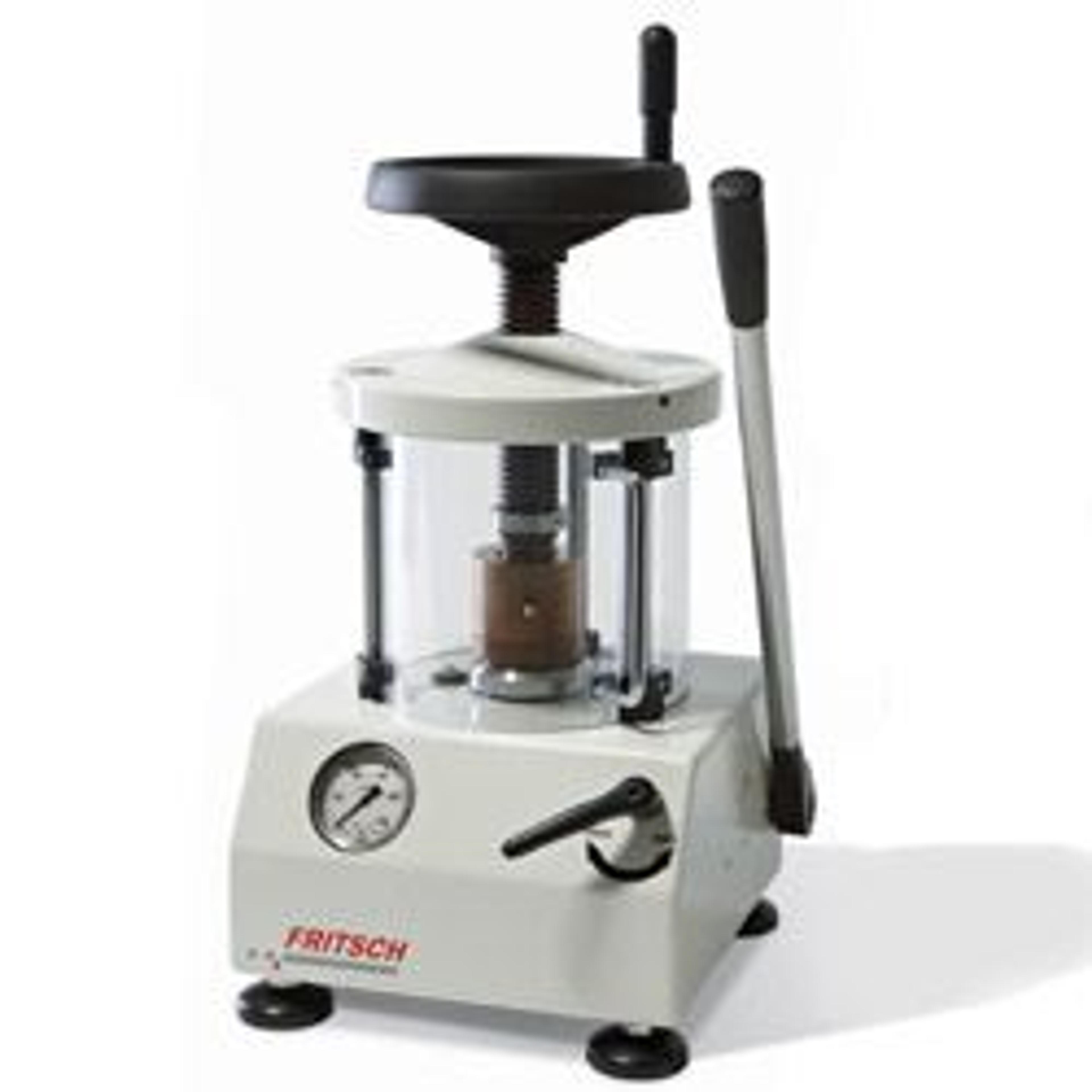 Manual hydraulic Pellet Press for the preparation of pellets with a smooth, homogeneous surface for spectral analyses such as X-ray fluorescence analysis or infrared spectroscopy for elementary analysis. Ideal for the manufacturing of both: solid and highly permeable pellets of solid samples – fast and easy.