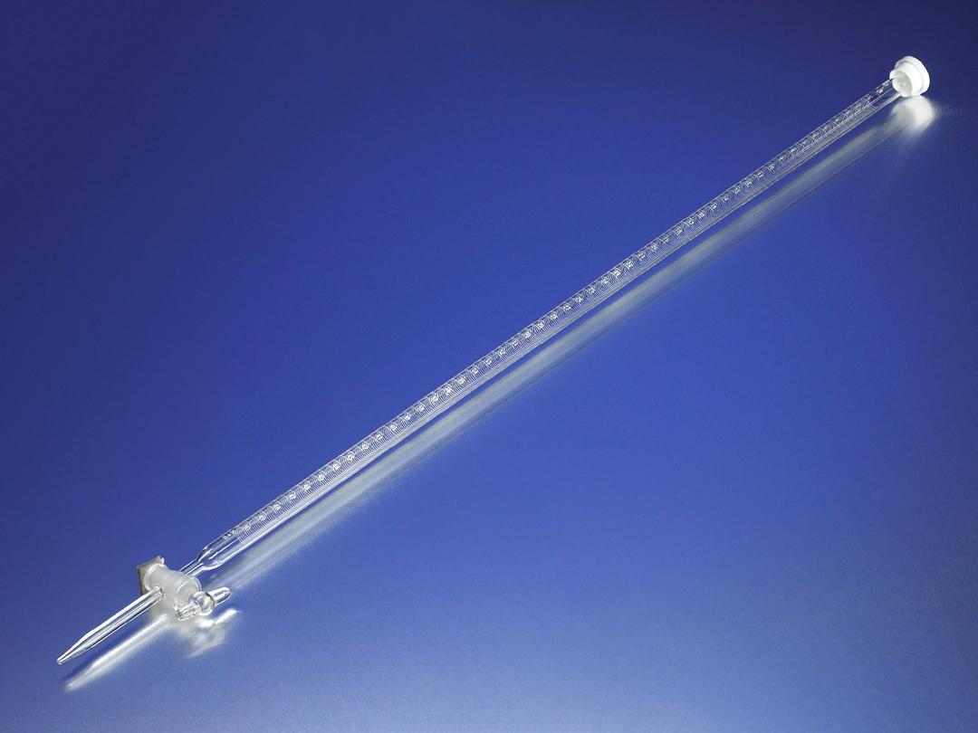 Precision bore tubing is used to assure accuracy between any two points. Durable colored graduations are sharply defined and easy to read. Carefully ground standard taper stopcock gives precise control. Each buret is supplied with a dust cover. All sizes furnished with a 2 mm bore stopcock plug. The capacity tolerance on these burets is established by ASTM E-287 and they are calibrated in accordance with ASTM E542.