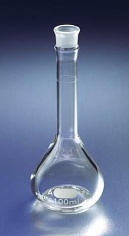 These 100 mL PYREX® EZ Access™ wide mouth volumetric flasks are calibrated to Class A tolerances and are designed for microchemical work. The heavy duty, wide mouth facilitates filling and mixing. Supplied with interchangeable No. 16 Standard Taper PYREX® ground glass stopper. For replacement stoppers, see No. 7650. The graduation line is sharp and permanent.