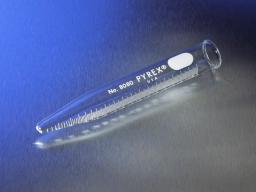 These 15 mL PYREX® conical centrifuge tubes have white enamel graduations. The 15 mL sizes are graduated upward from tip in 0.1 mL divisions