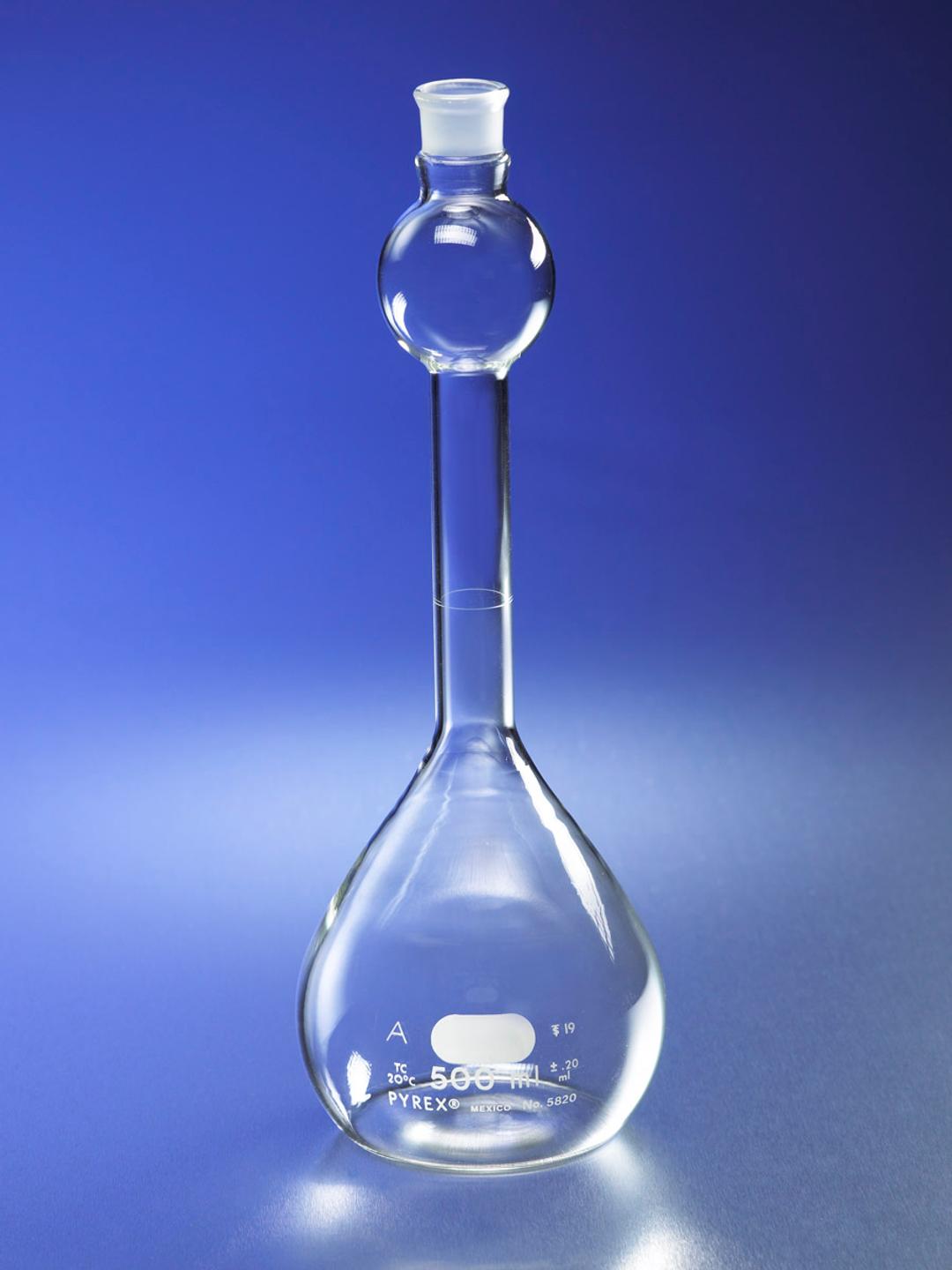 These 2L Class A PYREX® mixing volumetric flasks have an upper bulb, located between the Standard Taper stopper and the capacity graduation to assist in the mixing of liquids or powders when shaken.. This bulb is approximately one-twentieth capacity the flask. The strength of these flasks has been increased appreciably through machine-blown bodies to which are sealed heavy-tubing necks tooled for No. 27 Standard Taper glass st…