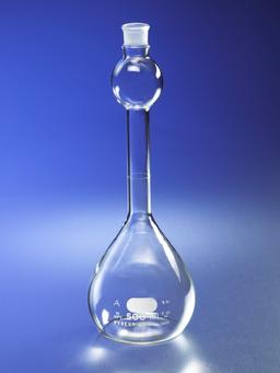 These 2L Class A PYREX® mixing volumetric flasks have an upper bulb, located between the Standard Taper stopper and the capacity graduation to assist in the mixing of liquids or powders when shaken.. This bulb is approximately one-twentieth capacity the flask. The strength of these flasks has been increased appreciably through machine-blown bodies to which are sealed heavy-tubing necks tooled for No. 27 Standard Taper glass stoppers. For replacement stoppers see No. 7650. These Class A volumetric flasks have been manufactured to Class A tolerances as established by ASTM E- 694 for volumetric ware, ASTM E-542 for calibration of volumetric ware and ASTM E-288 for volumetric flasks.