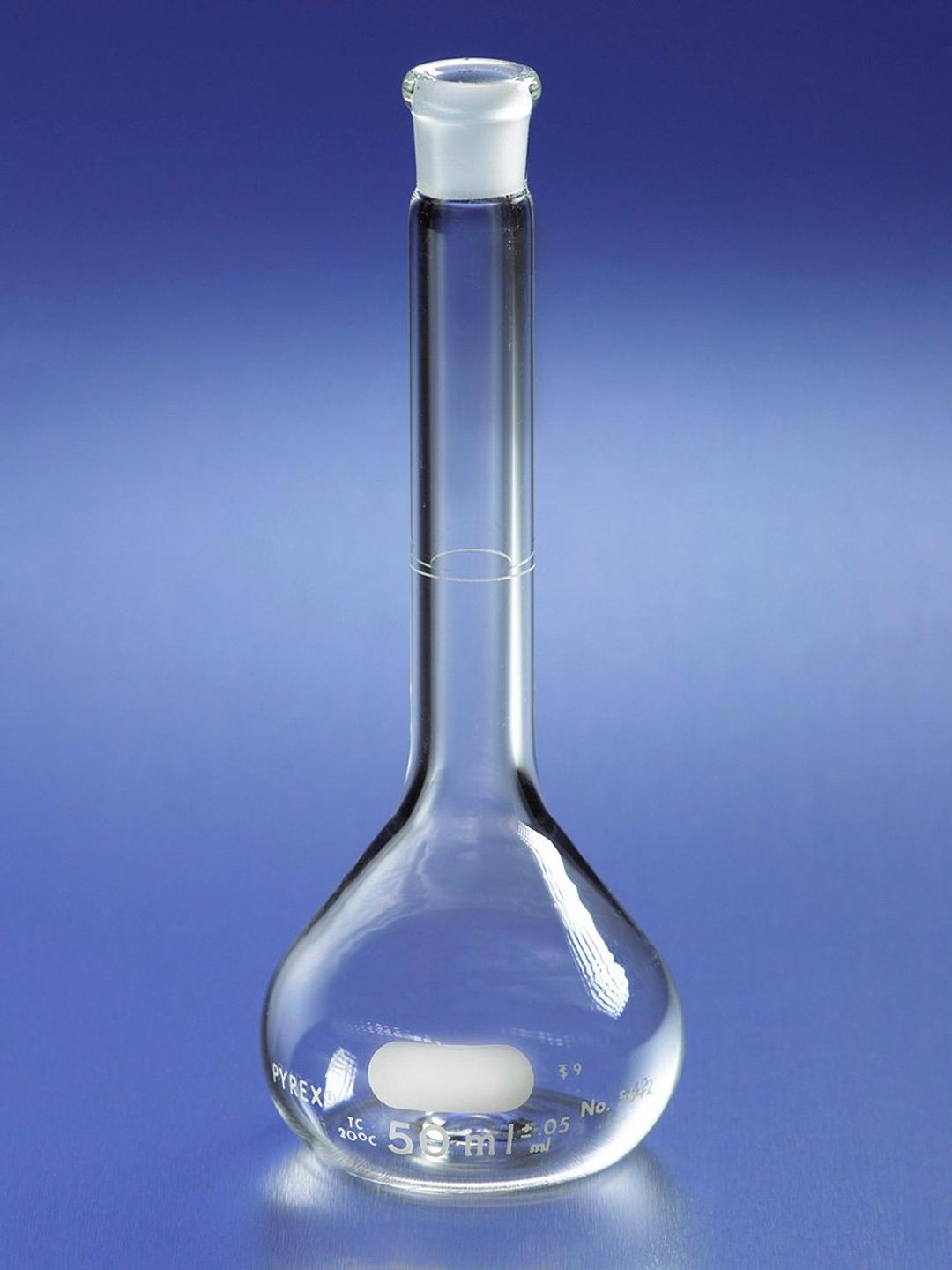 These 2L Class A PYREX® volumetric flasks have machine-blown bodies to which are sealed heavy-beaded, heavy-tubing necks, tooled for No. 27 Standard Taper polyethylene stoppers. The linear high density polyethylene stoppers are made with a closed bottom to conform to Standard Taper stopper dimensions. For replacement stoppers see No. 7624. The graduation line is sharp and permanent and large white block letters make the inscription easy to read. These Class A volumetric flasks have been manufactured to Class A tolerances as established by ASTM E- 694 for volumetric ware, ASTM E-542 for calibration of volumetric ware and ASTM E-288 for volumetric flasks.