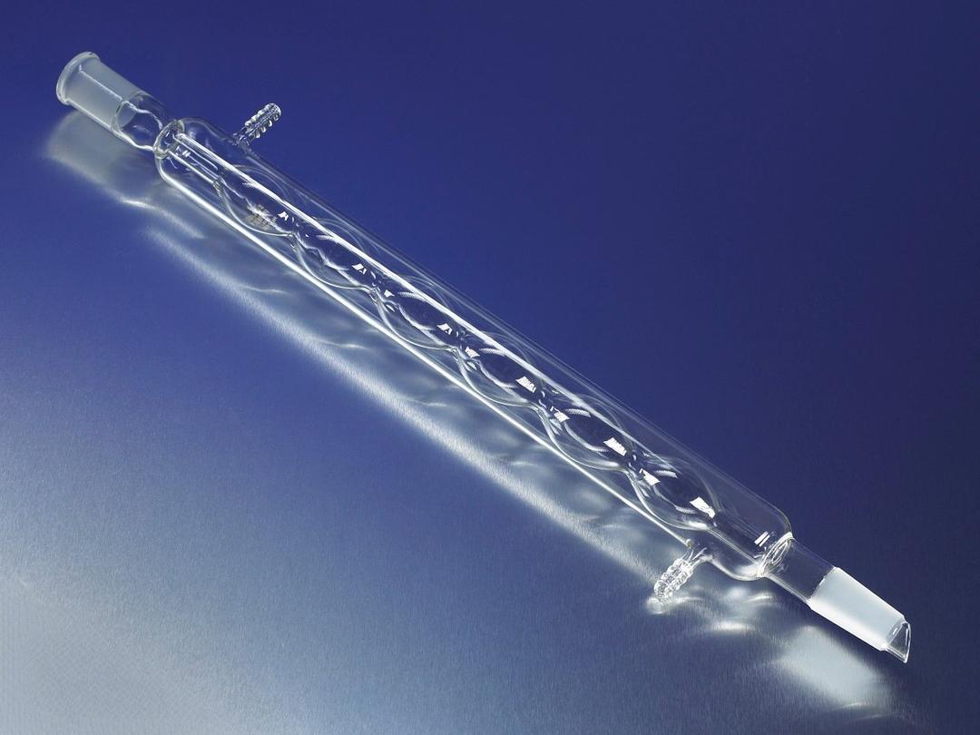 These widely used 3 bulb PYREX® condensers have a greater surface area than the corresponding Liebig type and are suitable for use in vacuum distillations. They have an outer 19/38 Standard Taper joint at the top and an inner 19/38 Standard Taper joint at the bottom with a drip tip. The tubulations have an O.D. of approximately 10mm.