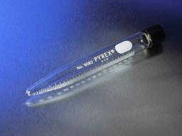 These 50 mL PYREX® conical centrifuge tubes have white enamel graduations for durability. The 15 mL size is graduated upward from the tip in 0.1 mL divisions. The 50 mL size is graduated upward from tip to 10 mL in 0.5 mL divisions, and from 10 to 50 mL in 1 mL divisions. The phenolic 24-410 GPI threaded screw cap is fabricated of a resin which is specially formulated to resist the effects of temperature and steam. Caps have a glued-in, white rubber liner. For replacement caps, see No. 9999.