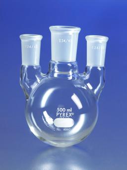 These 500 mL PYREX® three neck flasks have two vertical side necks with 24/40 full length outer Standard Taper joints and a larger vertical center neck with a full length 34/45 Standard Taper joint.