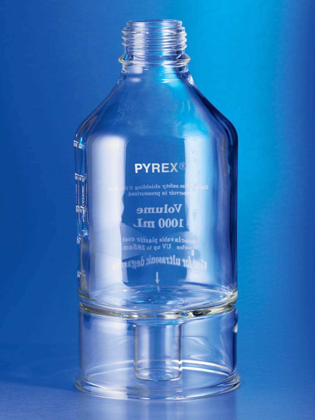 These PYREX chromatography reservoirs have a central cavity for a mobile phase inlet reservoir, an autoclavable plastic coat that absorbs UV up to 385nm, and a GL-45 thread finish. These may be used with our 3-hole cap #1395-3H.
