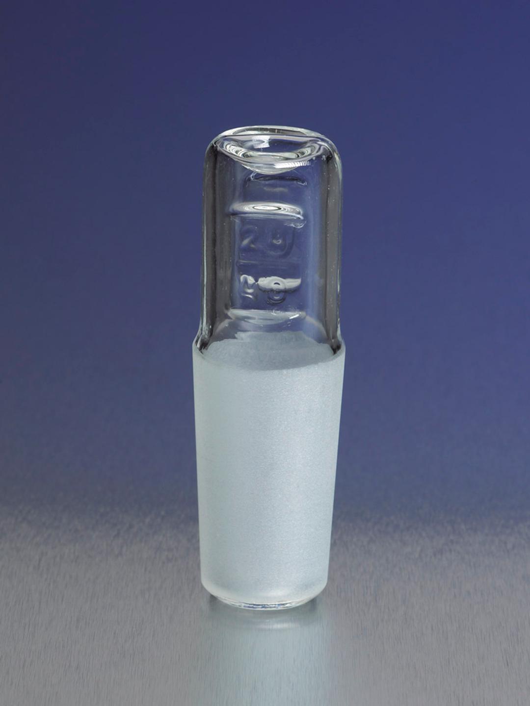 These hollow full length PYREX® 19/38 Standard Taper joint stoppers are closed at the bottom. They are interchangeable with standard taper joints of the same size. These hollow stoppers are light in weight, yet very strong to reduce chipping and breakage, thus minimizing replacement costs. A barrel-shaped head means it is easy to clean and even easier to rotate in or out. Grooves in the sides help prevent slippage. The flat top allows the stopper to stand on its head, which frees the user's hand and minimizes potential contamination.