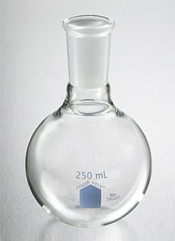 These 250 mL PYREX® VISTA™ round bottom boiling flasks have full length outer 24/40 Standard Taper joints, but with shorter necks. Wall thicknesses are controlled to provide balance between thermal expansion and mechanical strength for greater shock resistance. The 250 mL round bottom boiling flask is designed to ASTM E-1403. Adapter Nos. 8800, 8820 and 8825 are used to connect flasks with different size joints, thus allowing numerous combinations for diverse assemblies.