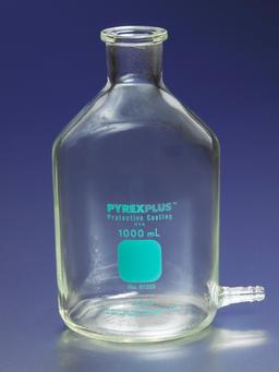 Bottle has a protective PVC coating for longer product life and safety. Protective coating helps prevent glass from shattering and reduces spills. Autoclavable (121°C) and resistant to thermal shock. Bottle features a tubular sidearm outlet for attachment of flexible tubing. The tubulation is not coated to allow easy connection of standard size tubing.