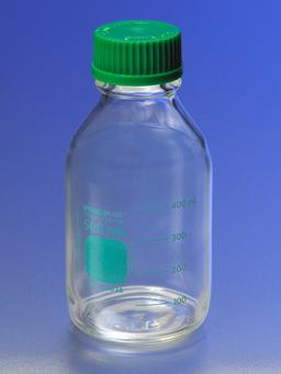 Heavy duty bottle which can be used for storage as well as mixing and sampling. A protective PVC coating helps prevent glass from shattering and reduces spills. Autoclavable (121°C) and resistant to thermal shock. Bottle comes complete with autoclavable, one-piece, green colored, polypropylene plug seal cap with drip-free pouring ring. Glass bead indicates full capacity line. Teal enameled graduations and marking spot. Thread size: GL 45. Neck opening: 29 mm I.D.
