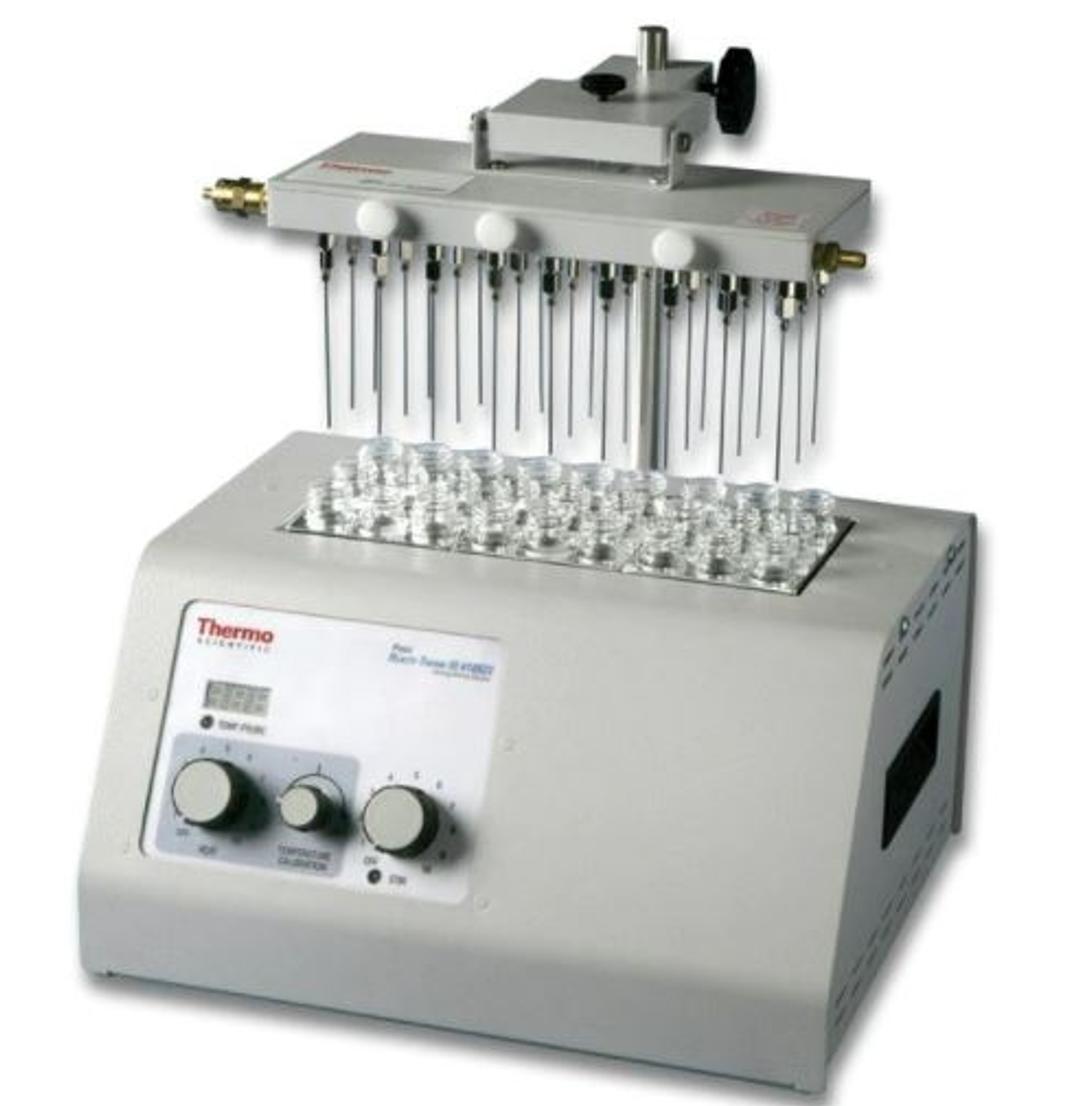 We use the ThermoFisher Scientific Reacti-Therm III heating module for several of our extractions. It has a temperature dial to change the temp, and it has an attachment that we use to blow nitrogen over our samples that we are evaporating. It works great, its a workhorse, we've never had any problems with it.