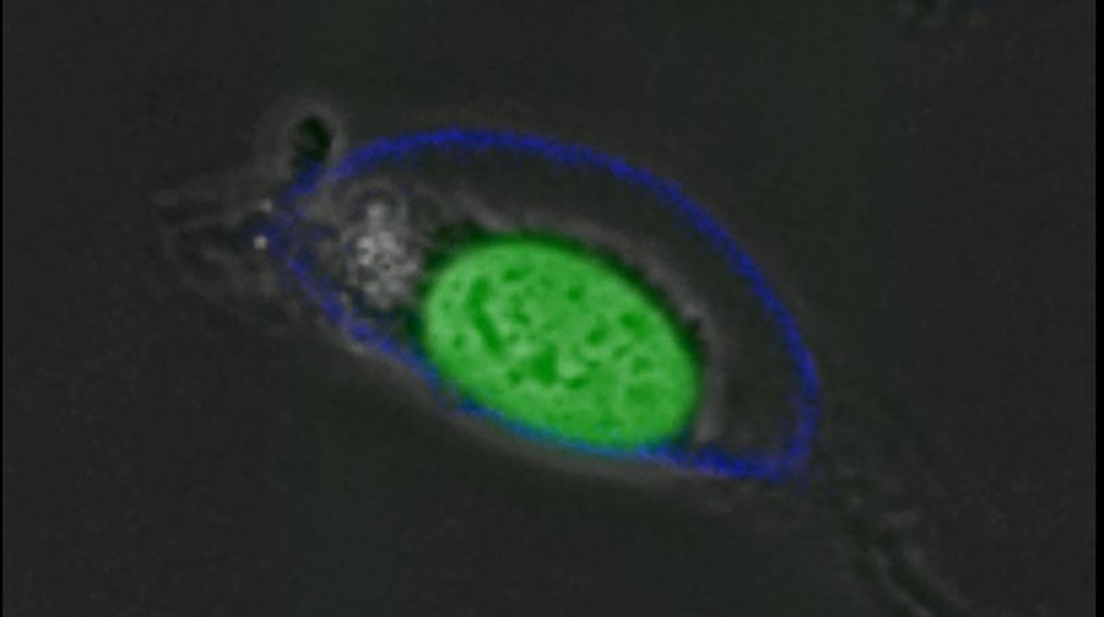 A single cell undergoing apoptosis visualised using RealTime-Glo™ Annexin V on an Olympus LV200 luminescence microscope. Exposure of Phosphatidylserine on plasma membrane (shown as blue signal) and loss of membrane integrity (shown as green signal).