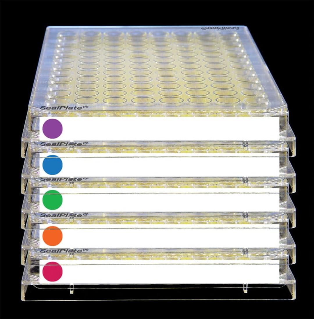 SealPlate® ColorTab™ adhesive sealing films consist of 50 µm thickness clear polyester. They minimize evaporation, prevent spillage and contamination between wells, and provide a secure seal for ELISA, EIA, and similar assays. These unique sealing films include a color dot and white writing area on each end tab for plate ID labeling. End tabs with backing removed adhere to the ends of the plate and are perforated so they can b…