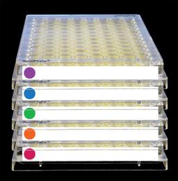 SealPlate® ColorTab™ adhesive sealing films consist of 50 µm thickness clear polyester. They minimize evaporation, prevent spillage and contamination between wells, and provide a secure seal for ELISA, EIA, and similar assays. These unique sealing films include a color dot and white writing area on each end tab for plate ID labeling. End tabs with backing removed adhere to the ends of the plate and are perforated so they can be left in place to maintain plate identity even if the center portion of the sealing film is removed. Alternatively, one inscribed color-coded end tab can be removed and pasted in a laboratory notebook while the other remains on the plate for identification. Dimensions 79.4 by 146.1 mm for 96-well plates. Sealing films are supplied with five dot colors (green, lavender, orange, red, blue) in non-sterile single-color packs of 100 and in assorted packs of 50 containing five individual-color packs of 10, also non-sterile.