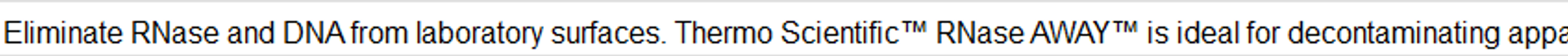Eliminate RNase and DNA from laboratory surfaces. Thermo Scientific™ RNase AWAY™ is ideal for decontaminating apparatus, bench-tops, glassware and plasticware. It reduces dependency on carcinogenic DEPC treatments and saves time needed to bake glassware.