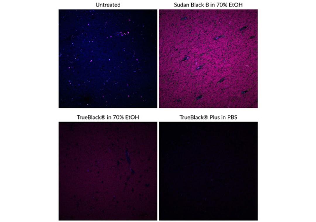 TrueBlack® Plus is a next-generation lipofuscin quencher developed by Biotium chemists. TrueBlack® Plus is water-soluble, so quenching can be performed in PBS instead of ethanol. It greatly reduces lipofuscin autofluorescence with minimal far-red background.