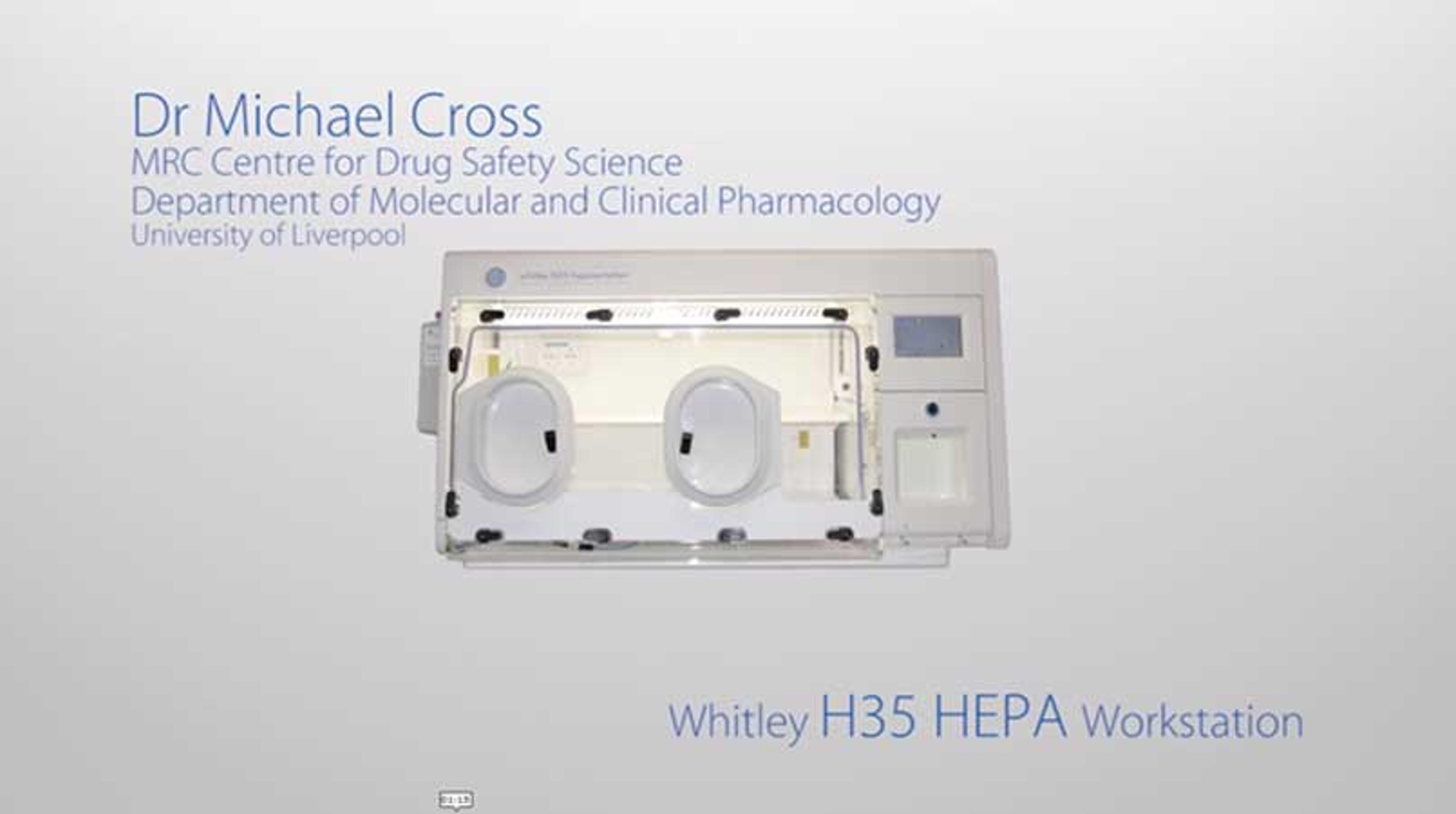 Dr. Michael Cross from the MRC Centre for Drug Safety Science, Department of Molecular and Clinical Pharmacology, University of Liverpool, discusses how the Whitley H35 HEPA Workstation is used in his research. Dr. Cross also describes the features that make this workstation perfect for his application and his experiences with Don Whitley Scientific.