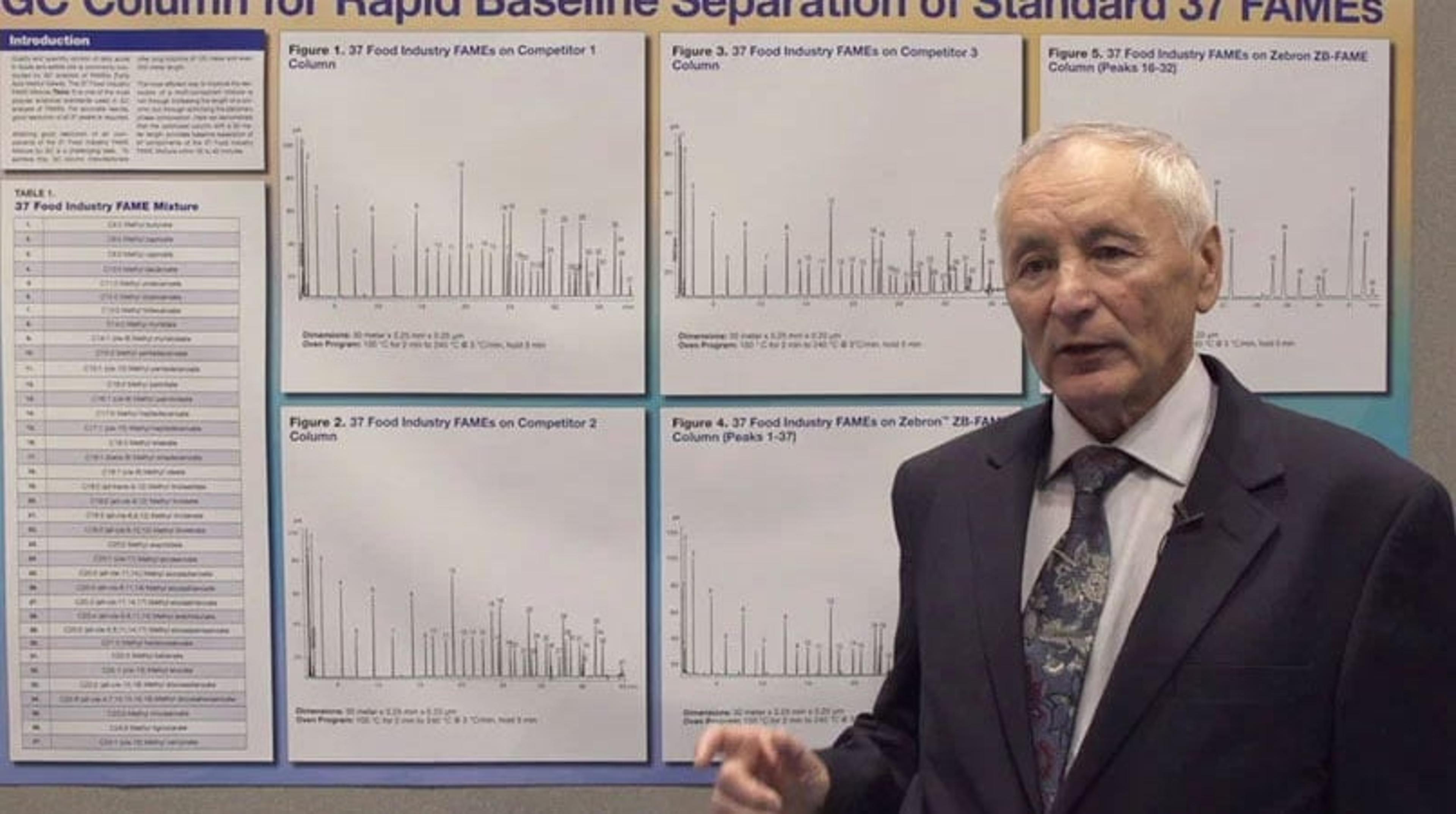 Yuri Belov, Senior Scientist at Phenomenex, describes how he is developing new columns for assessing cis and trans fats in foodstuffs using gas chromatography. He presents his poster which shows how his new 30 meter column, the Zebron™ ZB-FAME GC Column, has very good baseline separation of the most challenging standard test mixture, the 37 Food Industry FAME (fatty acid methyl ester).